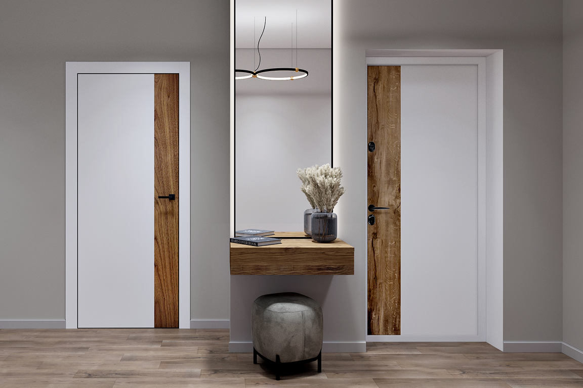 Фрезеровки-близнецы, декор и отделка синхронизированы, создавая целостный интерьерный ансамбль. В отделке — вставки из экошпона, который воспроизводит текстуру натурального дерева, и алюминиевые молдинги, поддерживающие современную стилистику входной двери.