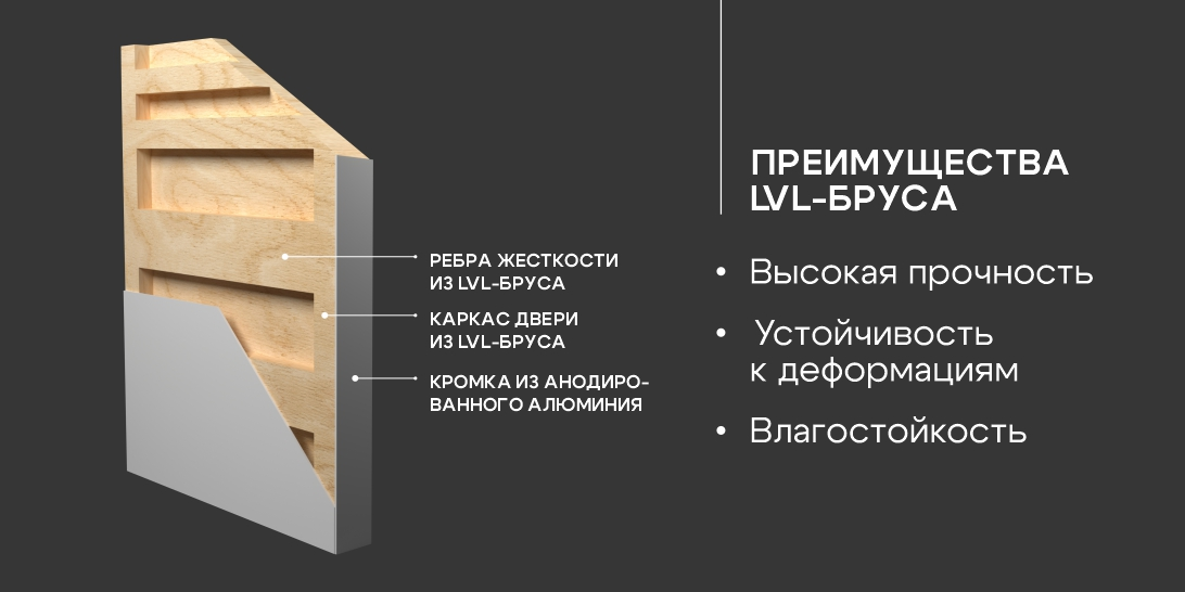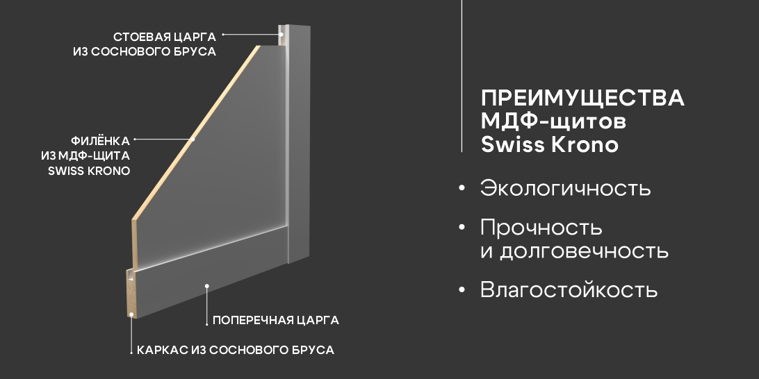 Каркасно-щитовая дверь — это цельная конструкция, которая состоит из каркаса (LVL-бруса), листов МДФ по обе стороны каркаса. Алюминиевая или ABS-кромка закрывает торец двери: защищает его от механических повреждений и поддерживает стилистику двери, благодаря различным цветовым решениям.