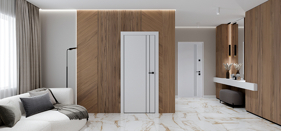 Мы подобрали одинаковые рисунки и цветовые решения для входных и межкомнатных дверей для создания единого гармоничного интерьерного пространства, в котором учтена каждая деталь.